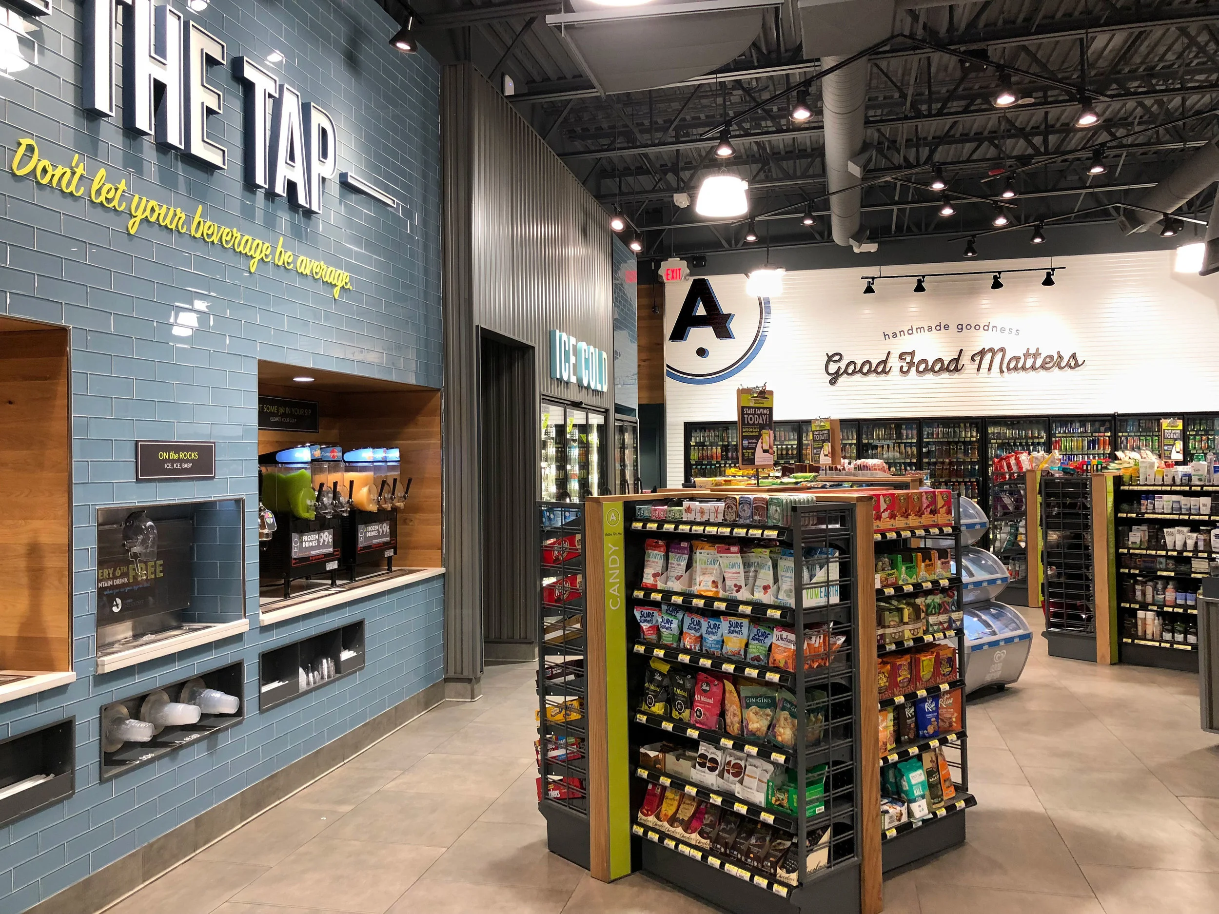 The interior utilizes a soft blue color pallet and wall tile to highlight the self-serve beverage bar with “taps” vs more traditional soda fountain machines to provide a more crafted and unique customer experience. And independent merchandising pods are used vs more traditional shelving to create a more open flow and making more products visible and more easily accessible.